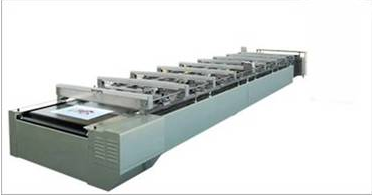 1 設(shè)備運行步驟 首先在導(dǎo)帶的預(yù)定位置用乳白膠粘貼白色毛巾坯,然后啟動伺服電機,電機經(jīng)蝸輪減速機減速后拖動輸送帶,當(dāng)輸送帶上的毛巾對準(zhǔn)印花平網(wǎng)的位置停穩(wěn)后,平網(wǎng)網(wǎng)框下壓貼緊毛巾,通過網(wǎng)框上方的刮刀緊貼網(wǎng)框刮刷,將平網(wǎng)內(nèi)放置的顏料透過鏤空的圖案印染到毛巾上。第一個顏色的圖案印完了,網(wǎng)框抬起,導(dǎo)帶將毛巾送到下一個網(wǎng)框位置停穩(wěn),開始第二個顏色圖案的印染………,直到十個顏色依次套準(zhǔn)印完,一條彩色毛巾才告完成,而第二條毛巾緊接著第一條毛巾不間隔地套色印染………,周而復(fù)始,連續(xù)作業(yè)。印刷部分如圖1所示。