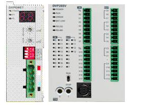 2.2 方案制定 控制器采用DVP28SV11T。28SV提供左側(cè)并列式高速擴展。由于方案需要通過CANopen通訊,所以選用此款PLC并擴展DVPCOPM-SL,如圖3所示。  圖3 左側(cè)為DVPCOPM-SL,右側(cè)為DVP28SV11T 牽引部分要求走精確定位,這樣每個顏色才能印到恰當(dāng)?shù)奈恢,不至于跑色。選用ASD-A5523-B伺服。因為導(dǎo)帶比較長,負(fù)載比較大,所以5.5kW伺服配20比1的減速機。如圖4所示。